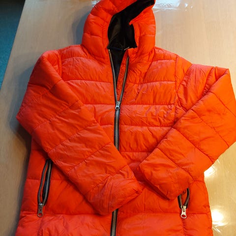 Fin overgangsjakke i str 104 i lyserød (den ser rød ud på billedet, det er den ikke). Har desværre fået lidt pletter på det ene ærme, men ikke noget tydeligt. Man skal se efter det for at finde det (se billede).