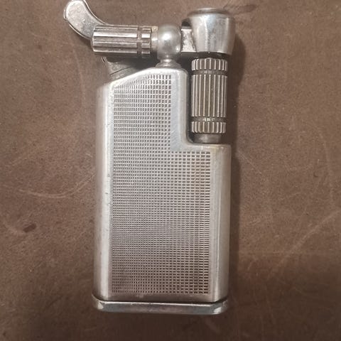 Pibe lighter med gravering af sol, måne og stjerner og etui i læder. Den mangler sten. Der er naturlige ridser efter brug. men ellers flot.