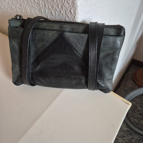 Fin clutch i sort åleskind, mål ca. 11x13 cm.