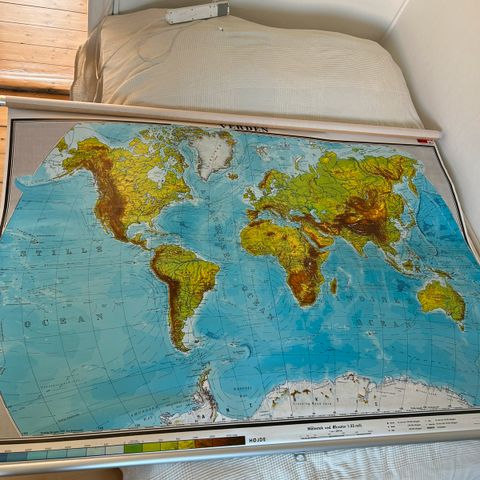 Kortet er lavet til at blive båret fra klasselokale til klasselokale og er derfor med manuelt oprul, låsebeslag og snor - lige til at hænge op. Alt sammen originalt, og som jeg husker det fra folkeskolens klasseværelse.