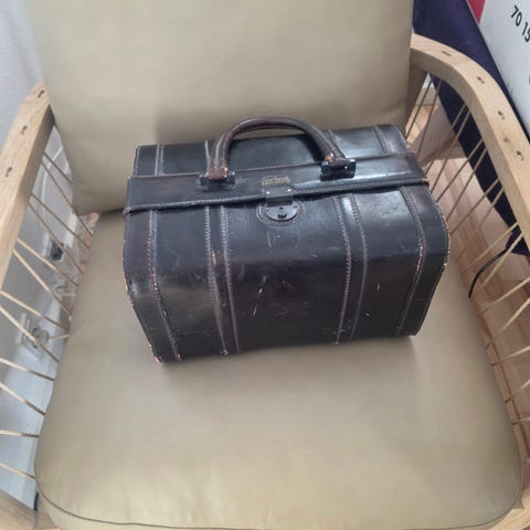 Meget smuk, robust, rummelig og velholdt beauty box i det fineste sorte læder. Stort stabilt rum med 4 stropper til at holde flasker stående opret. Indvendigt rum med lynlås.