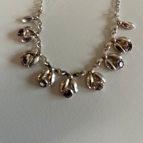 En smuk halskæde med syv integrerede vedhæng med hver en blå facetteret sten. Flot stand. 38 cm lang. Stemplet Sterling Denmark HS