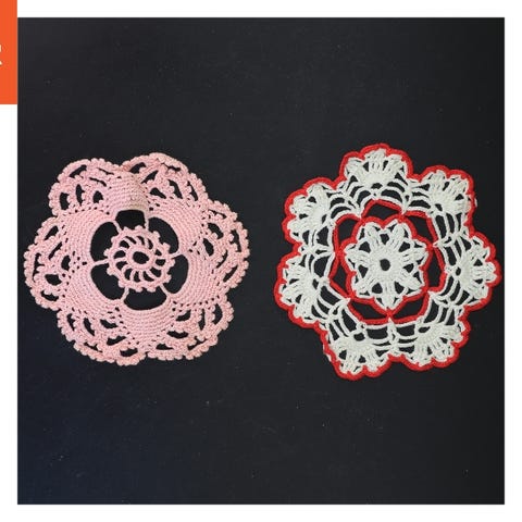 Virkeligt smukt unikt håndværk i form af et “ billede “ lavet af 3 små hæklet duge, som er lagt ovenpå hinanden . Indrammet i en egetræs ramme .