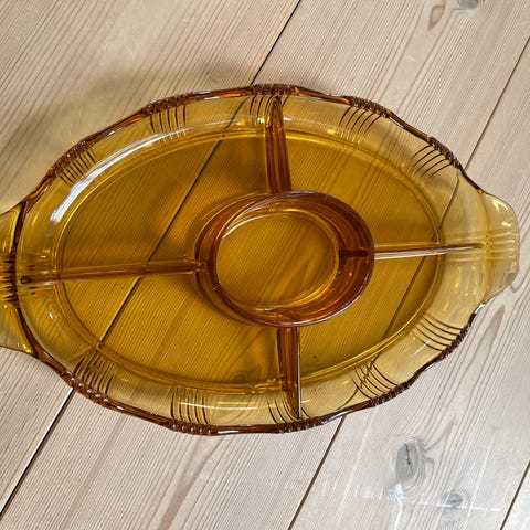 Glasskål der måler 20 x 11,5 x 3,5 cm.. RAVFARVET. I god stand. Vintage