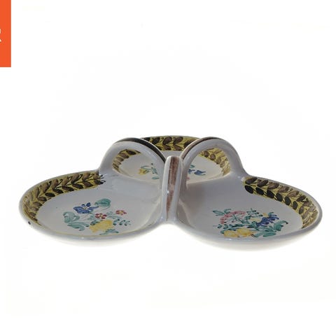 Cabaretfad, syv skålet med gul bladkant, som også ofte anvendes på urtepotterne. Signaturen a er Else Marie Andersens, der virkede som maler pige 1936-50.