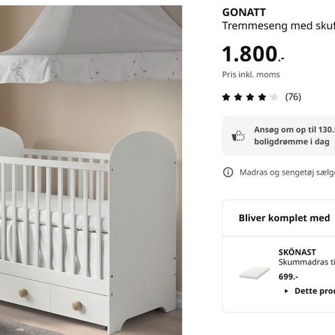 VELHOLDT IKEA Gonatt tremmeseng + NY pocketfjeder madras og sengehest