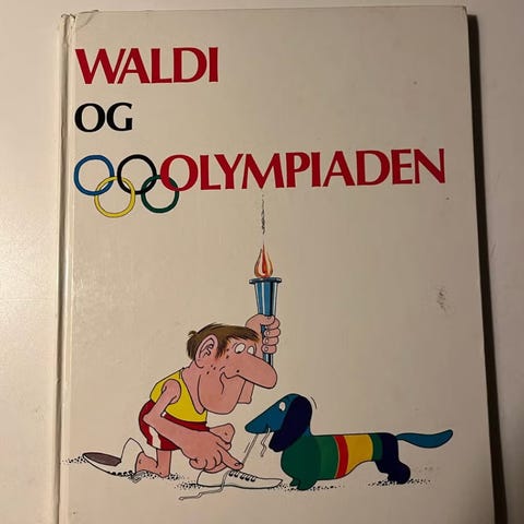 Waldi og Olympiaden, Retro, “Waldi og Olympiaden” af Erik Buus. Hardback udgivet af Carlsen i 1972. Gravhunden Waldi var maskot i forbindelse med sommer-OL i München 1972. Pæn stand!
