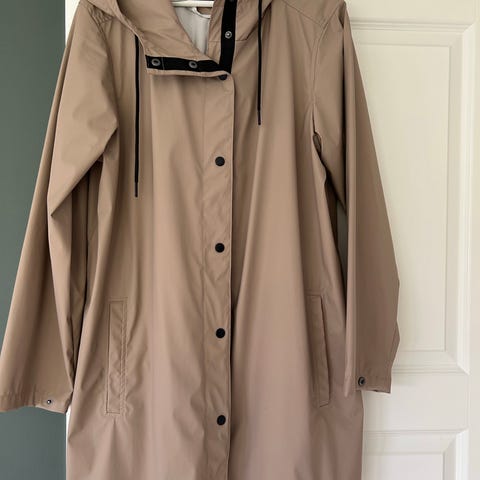 Regnjakke er med lynlås, har snøreluk ved hætten og justerbar talje samt slids med knapper i siden