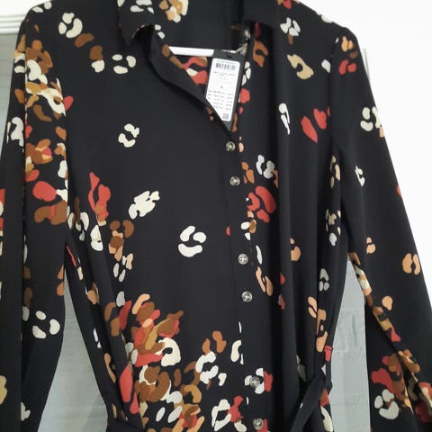 Kjolen er lang, har lange ærmer samt gennemgående knapper.