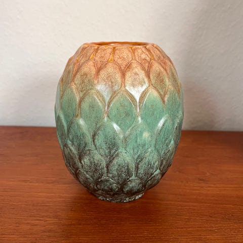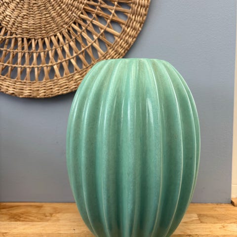 Designer Carlo Rosberg har designet denne store vase med figurer på begge sider . Den er lavet ved Michael Andersen på Bornholm. Den har nogle små hak kan ses på nogle af billederne . Den er 42 cm høj og 20 cm tyk og 30 cm bred. Meget flot glasur.
