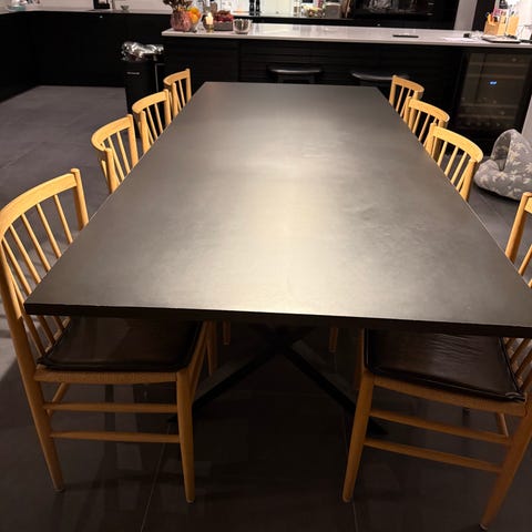 Sælges. Bordet er institutionskvalitet med fantastisk gul-marmoreret linoleum. Bordpladen er ca 2,7 cm tyk. Bordet har brugsspor både på ben og kanttræ i form af slidt lak og lidt ridser. Linoleumspladen fremstår pæn med almindelige brugsspor.