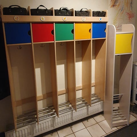 Fin børnegarderobe, meget stabil og fremstår i god stand med brugsspor. Hylden på billedet kan også monteres som sæde.