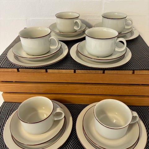 20 Kaffekopper m. underkop - 29 dessert tallerkner, 5 middags tallerkner - 7 frokost tallerkner - 1 saltkar - 16 dybe tallerkener - 10 kr pr. stk.