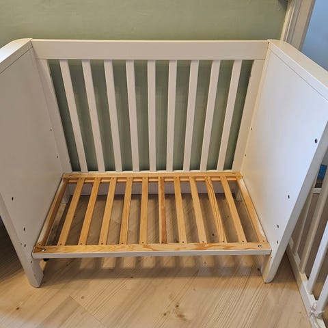 Tremmeseng i hvid farve. Du kan nemt selv indstille bunden i tre forskellige niveauer, så du tilpasser højden efter barnets størrelse.