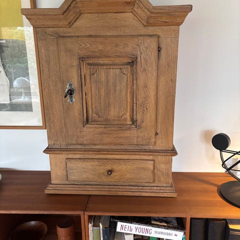 Lille skab af træ til montering på væg - eller til at stille på noget. Håndtag af metal. Lågerne har magnet lukning. Rigtig pæn stand.
