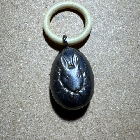 Andet smykke, andet materiale, Dansk, Gammel dansk baby rangle. Mangler den platik ring den sad på. Den er produceret i danmark men dens stempel er der ikke. Den måler ca. 5-7 cm.