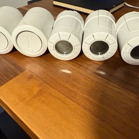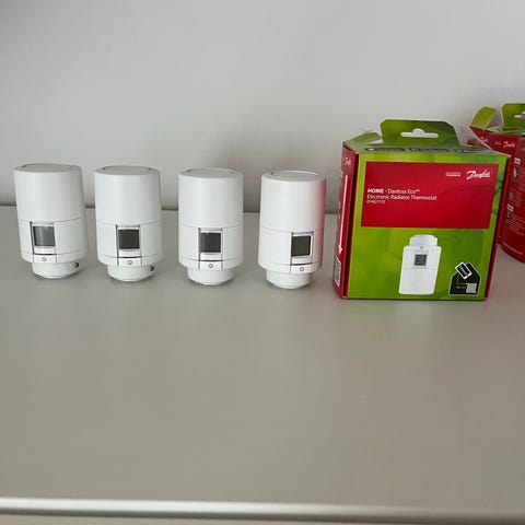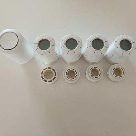 5stk fjernstyret danfoss termostat plus en programmerings skærm som kan forbindes til wifi'en derhjemme og kan styres fra udlandet.