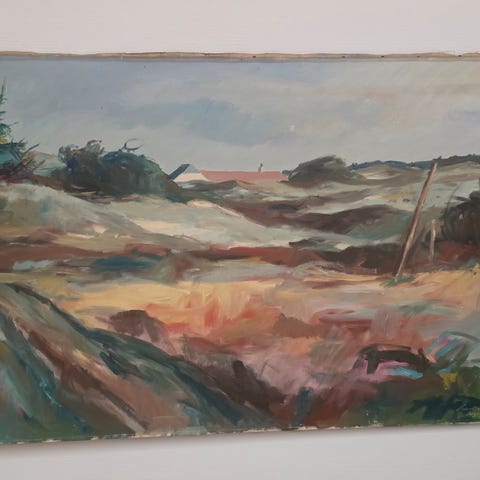 Flot og stemningsfuldt maleri, olie på lærred, af den anerkendte kunstner Ingemann Jørgensen (1921-1982). Motivet er en gård, med forlignelighed til Oluf Høsts Bognemark-motiver.