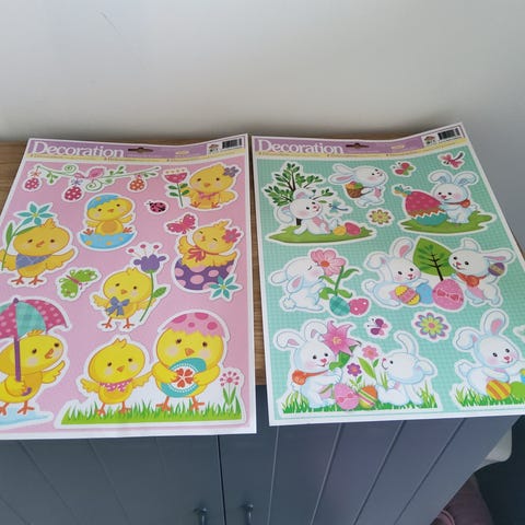 Der er 32 påskestickers i alt der kan sættes på vinduer, køleskab og andre hårde glatte overflader.
