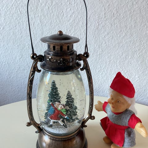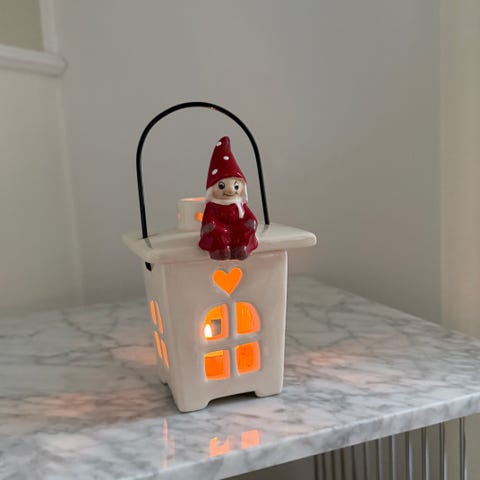 Sød lille jule lanterne i keramik med en nissepige på toppen.