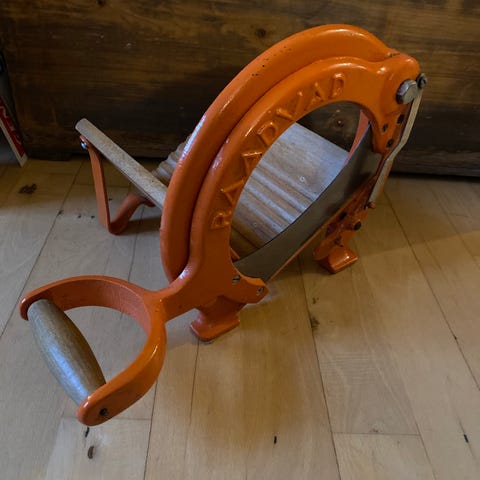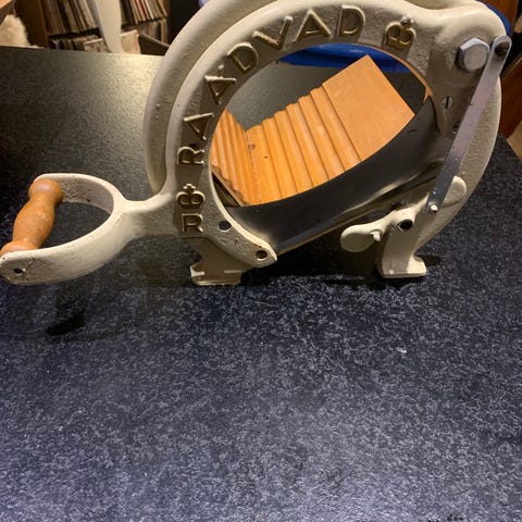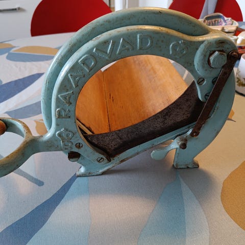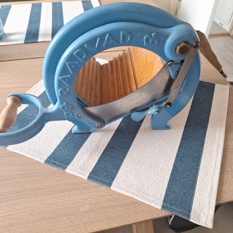Raadvad brødskærer og Madam blå kaffekande. Godt med patina. Låget på kanden sidder løst.
