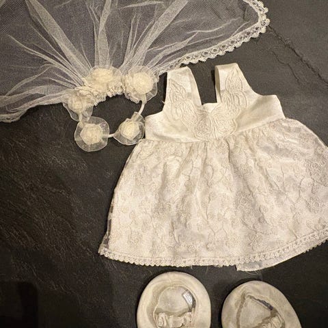 En kasse med blandet tøj til build-a-bear bamser.