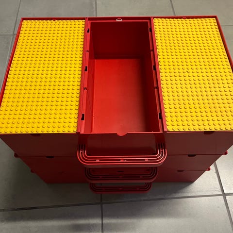 RETRO LEGO System opbevaringskasse i rød ternet mønster. Kassen er lavet af hårdt materiale med metalbeslag og et mørkeblåt håndtag til nem transport. Designet til opbevaring af LEGO klodser og tilbehør.