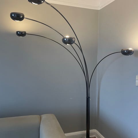 Antik standerlampe i smedejern med mange smukke detaljer. Højden kan justeres. Tænd og sluk knap findes tæt på lampeskærm.