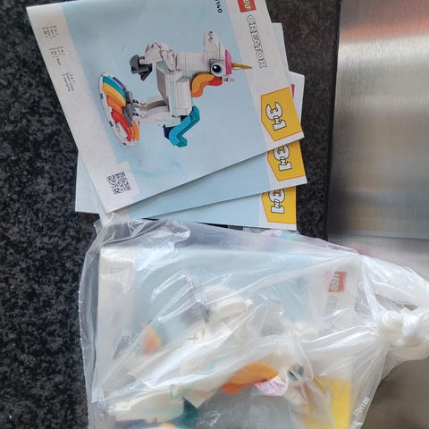 Model 31140 Magic Unicorn sælges. Uåbnet, men kassen har fået lidt skrammer. Sættet kan laves til tre forskellige figurer, enhjørning, søhest og påfugl.