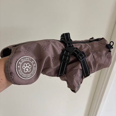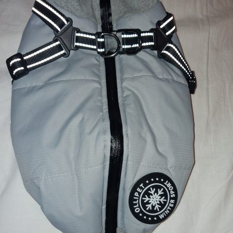 Hundebeklædning, Ollipet Aqua explorer regnjakke med sele i størrelse M sælges (bryst mål: 38cm, ryg mål 26 cm).