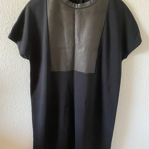 Smuk skindkjole med korte ærmer fra COS. I en meget smuk mørkegrå farve. Lukkes med trykknapper. Stiklomme i hver side. Aldrig brugt. Stadig med tags. Nypris kr. 3.000