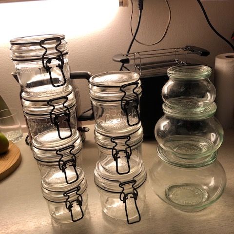 Glas, Sylteglas, Le Parfait, WECK, FIDO, og 3 uden navn., 6 WECK sylteglas der kan indeholde 2,5 dl . 2 Le Parfait “ Super” sylteglas der kan indeholde 5 dl. 3 små WECK sylteglas der kan indeholde 1,5 dl. 1 Le Parfait sylteglas der kan indeholde 2 dl. 1 glas med hvid tekst der kan indeholde 2,5 dl. 1 glas Fido sylteglas made in Italy der kan indeholde 2 dl. 1 lille OP sylteglas der kan indeholde 1 dl. Og det sidste uden tekst der kan indeholde 2,5;dl. Alle glas mangler gummiringene. Prisen er pr styk. Le parfait glassene er solgt og de andre med patentlåg er også solgt.