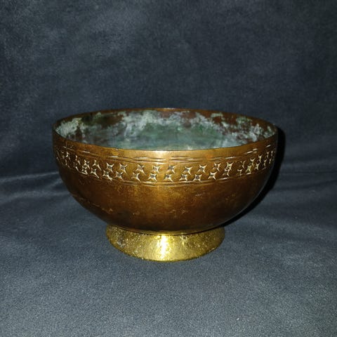 Lav ildfast bronze skål med låg. Indlagt floralt motiv i låget. Ingraveret B.K.K. 1’ Pr såden har været sportspræmie på et tidspunkt. Diameter 11cm og højde 3cm.X