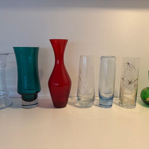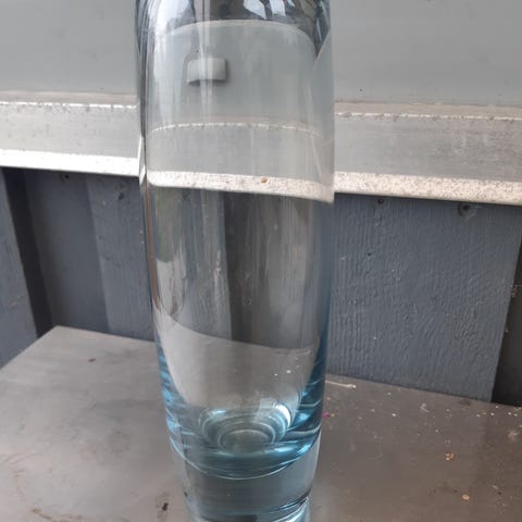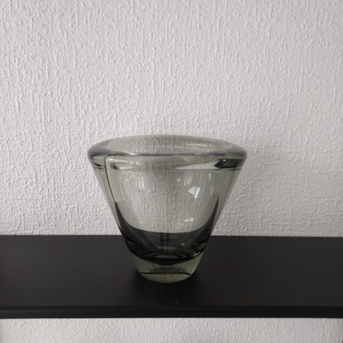 Min mors fine Per Lutken blå vase er fra 1960'erne - og den stod altid fremme til pynt på hendes reol. Vasen er 17 cm høj og ikke helt perfekt - der er nogle rande, jeg ikke kan få af. Men de ses faktisk ikke, når der er vand og blomster i vasen, så jeg håber, at man kan leve med det.