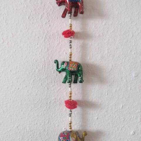 Fint "lille" ophæng med stof elefanter i fem forskellige farver med perler, klokker m.m.