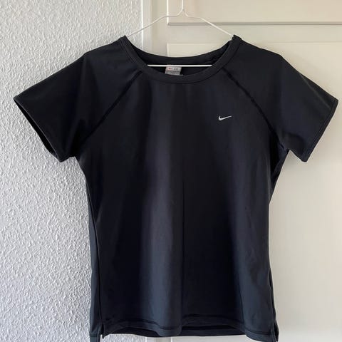 T-shirt fra Nike. Tynd, meleret stof. Korte ærmer. Lille logo foran ved det ene bryst. Lille detalje bagpå. 100 % genanvendt polyester. Brugt én gang. Fejler intet.