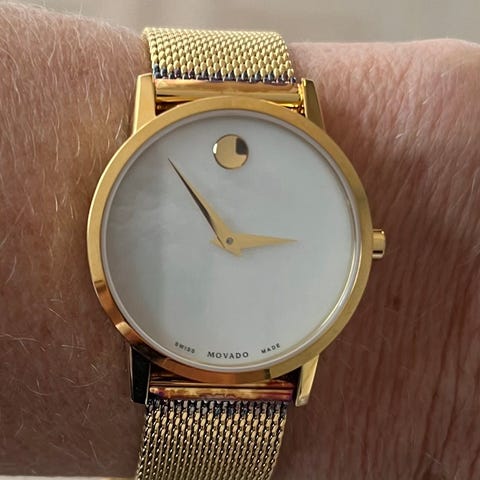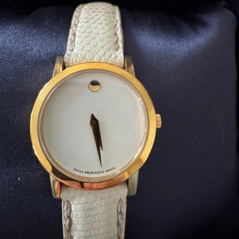 Dameur, Movado, Lækkert ur med guld krans og sort Skive. Sort læderrem. Brugt få gange.