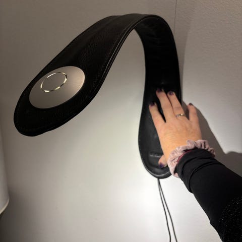 Super fin med svag lyserød skærm. Giver et godt fordelt lys a la le klints lamper.