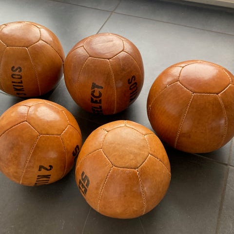 Tysk Medizin Ball 3 kg. fremstillet af Benz. Ægte læder. Omkreds 85 cm. Årstal ukendt, men gammel. Kan anvendes som retro-pynt
