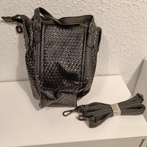 Flot sort taske med lille lomme foran, 28 cm høj og 48 cm bred, med lynlås og hank