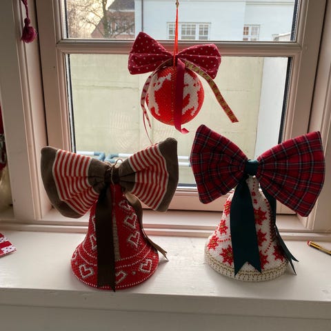 Perle jule kugle, Fin stor rød og hvid perle juleklokker. Højde 12 cm. Dia 13 cm på det bredeste sted.