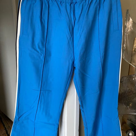 Længde 106 cm (hvis man ligger dem 3 cm op forsvinder stykket hvor de er syet, og de ser ud som nye), og livvidde 88 cm.