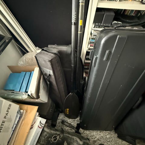 Der medfølger pagaj i glasfiber, transportvogn og sprayskirt.