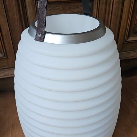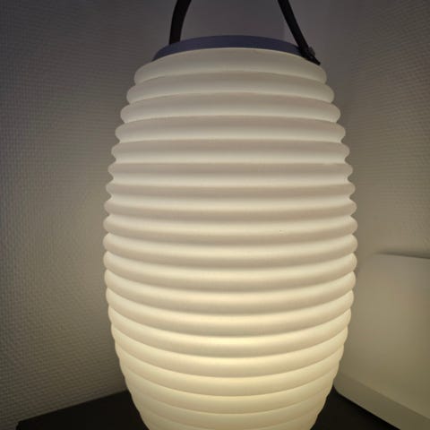 Asserbo lampe med indbygget bluetooth højtaler og batteri så den kan spille uden strøm. Foroven er der en fordybning til en flaske vin eller en plante. 68 cm høj.