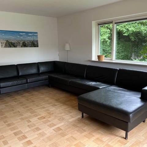 Grå hjørnesofa i lædder med løse sæde og ryghynder. Fremstår I pæn stand. Nypris 32.000 kr.