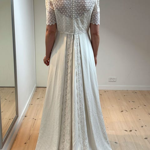Jeg er selv størrelse 34-36 og passer kjolen. Jeg har selv brugt den til vores vielse, og synes nu at kjolen skal videre og bringe glæde igen :-) Kjolen var virkelig smuk at bære og meget behagelig.