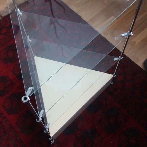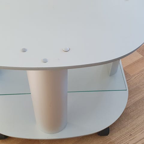 Fjersynbord, Fjersynbord eller sidebord på hjul med 3 hylder, nederste hylde kan trækkes ud, små brugsspor. Højde 45cm, bredde 54cm, dybde 40cm. (lot 2719)