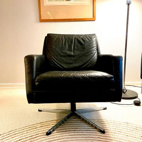 Luxor lænestol med skammel - betrukket med rødt læder.