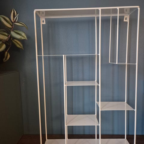 Hylden kan bruges som glashylde , meget dekorativ eller både som glashylde men også til at hænge tøj på bøjler samtidig. 1 stk buet hylde med tilhørende glashylde.