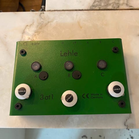 LEHLE 3AT1 SGOS! inkl. strømforsyning og midikabel. This True Bypass pedal switches the signals from magnetic and piezo pick-ups just as free of losses and background noise as it does line signals. The secret is in its gold-plated-contact relays and its active pop-and-click suppression. Any differences in level can be ironed out, and Inputs A and B lowered relative to C.